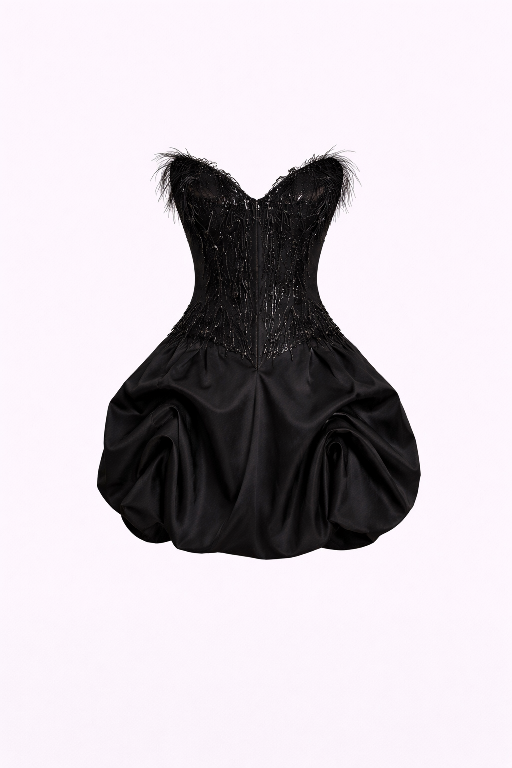 A couture-inspired two-piece set featuring a strapless textured bustier with feather-like detailing, paired with a voluminous mini skirt that adds dramatic structure. The sculpted bodice highlights the upper silhouette, while the statement skirt creates a bold and luxurious contrast. Designed for exclusive evening events, cocktail parties, and high-fashion occasions.